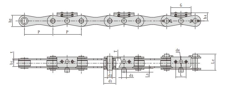 鏈號 節距 滾子直徑 內節內寬 銷軸直徑 銷軸長度 鏈板尺寸 附件尺寸 抗拉強度